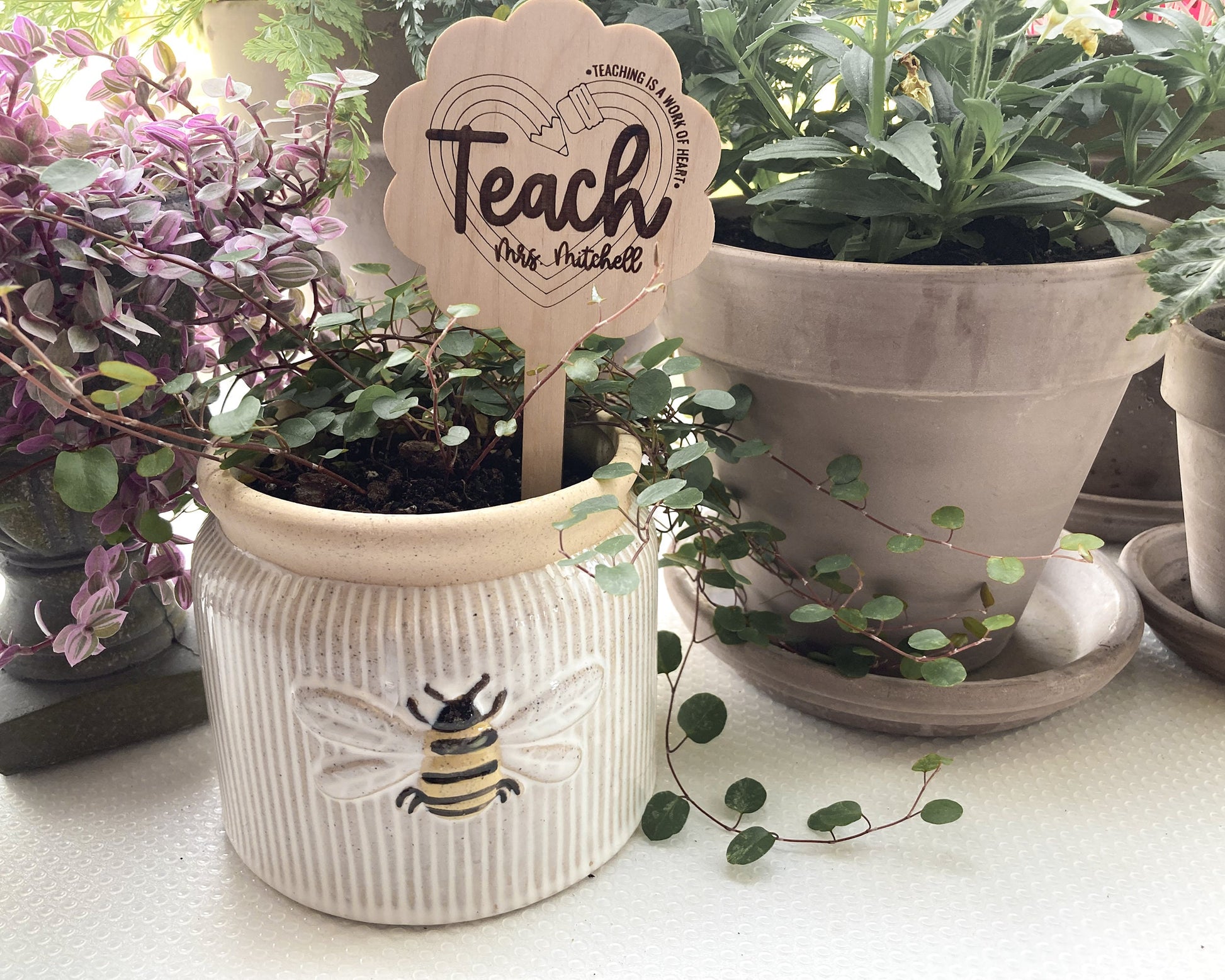 This charming wooden stake is the perfect token of appreciation for any teacher who goes above and beyond. With it's simple design and customizable features, it adds the perfect touch to any indoor or outdoor plant.
